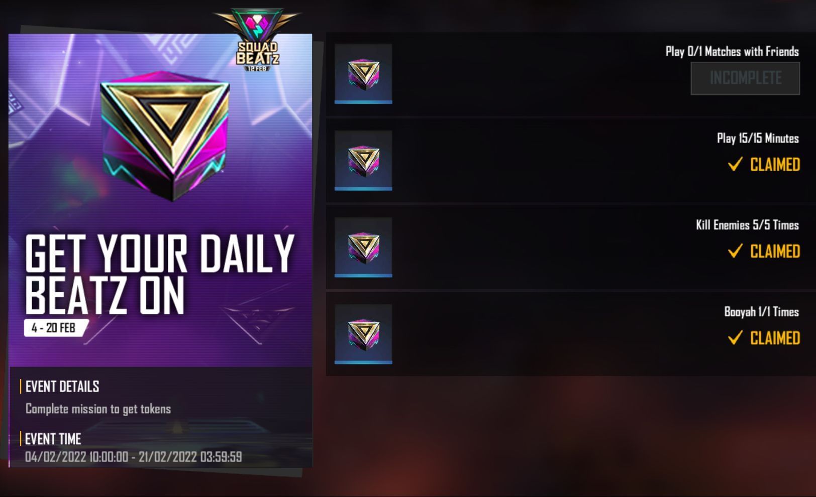 The Squad Beatz event in Free Fire commenced on 4 February, and the peak celebrations for the event will happen today, 12 February. The new event in the battle royale game has introduced many sub-events and challenges that players can take part in to win rewards.