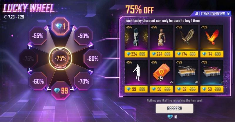 Step 2: Then, you must spin the wheel to get the percentage of the discount. After this, you can purchase one item at the given discount price. You can also refresh the item pool by spending diamonds.