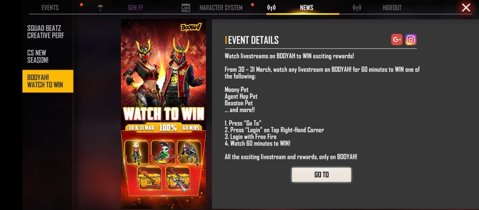 Out of the prizes listed above, players will only be able to claim one. They must watch live streams on the Booyah application for a span of 60 minutes to stand a chance of winning.