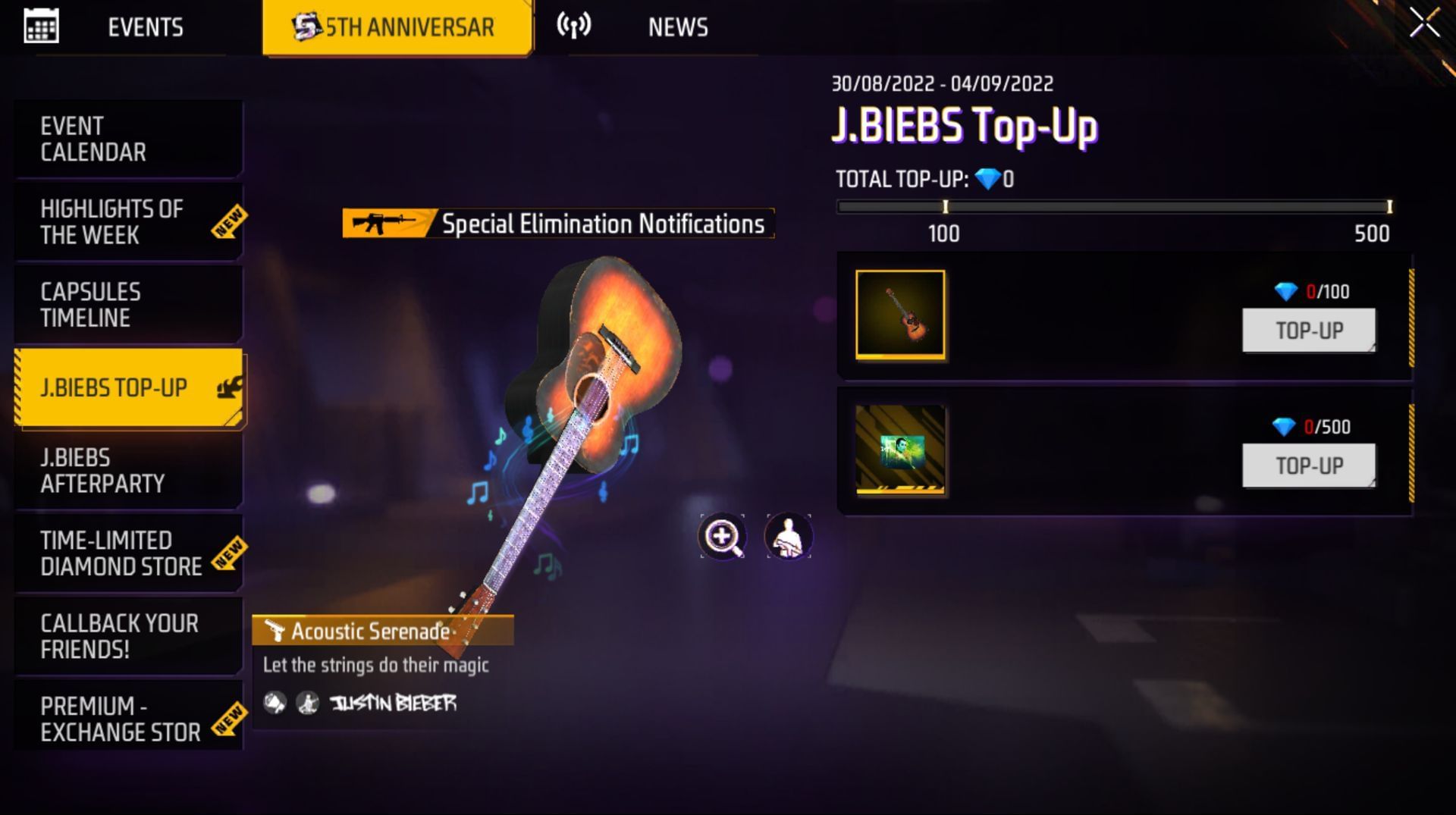 Step 3: Players can open the event section by clicking on the calendar icon and then selecting 'J.Biebs Top-Up' in the 5th Anniversary tab.