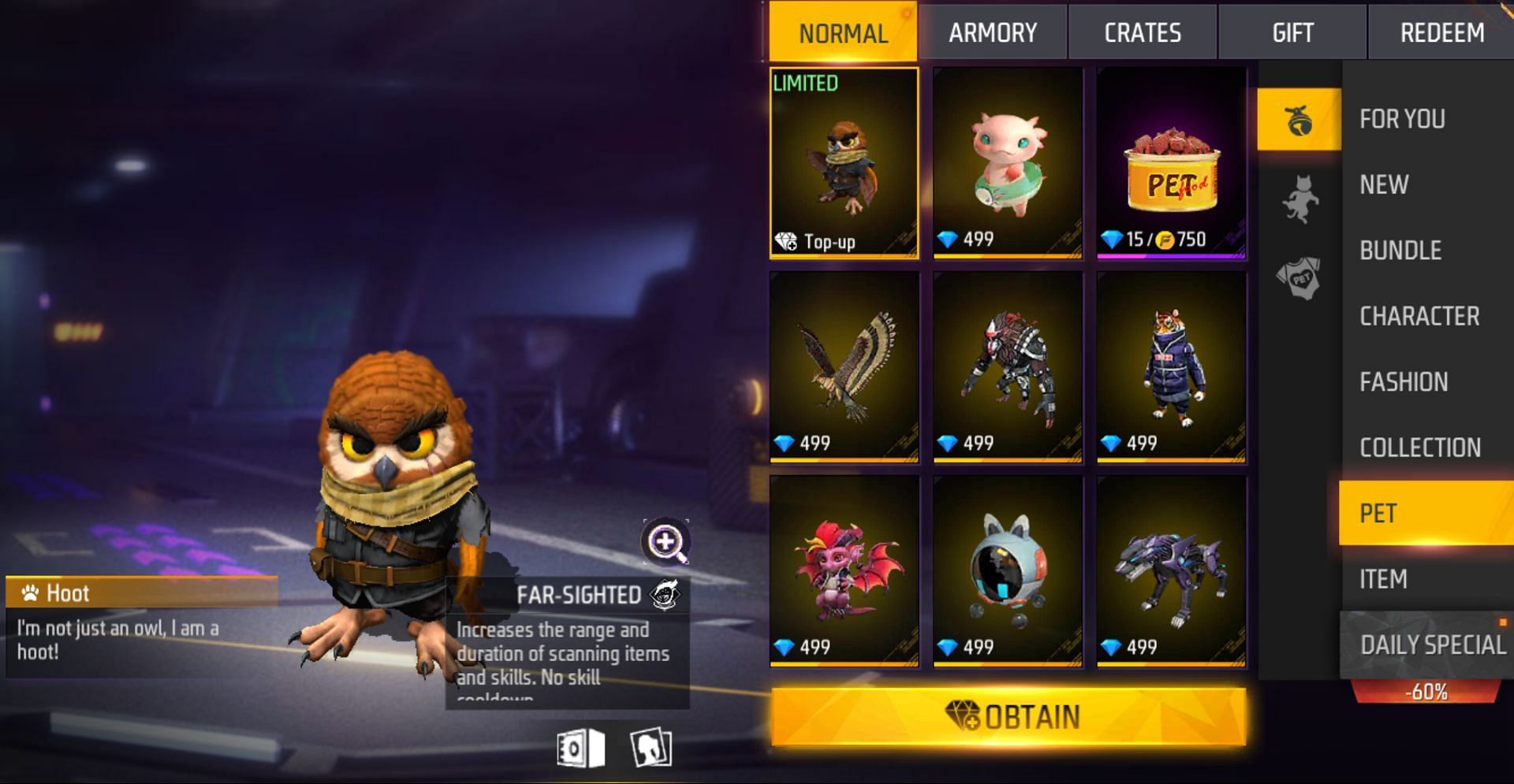 - Purchase 100 diamonds to get a free Hoot pet, Pet Skin: Hoot on Fire, and Show Off action