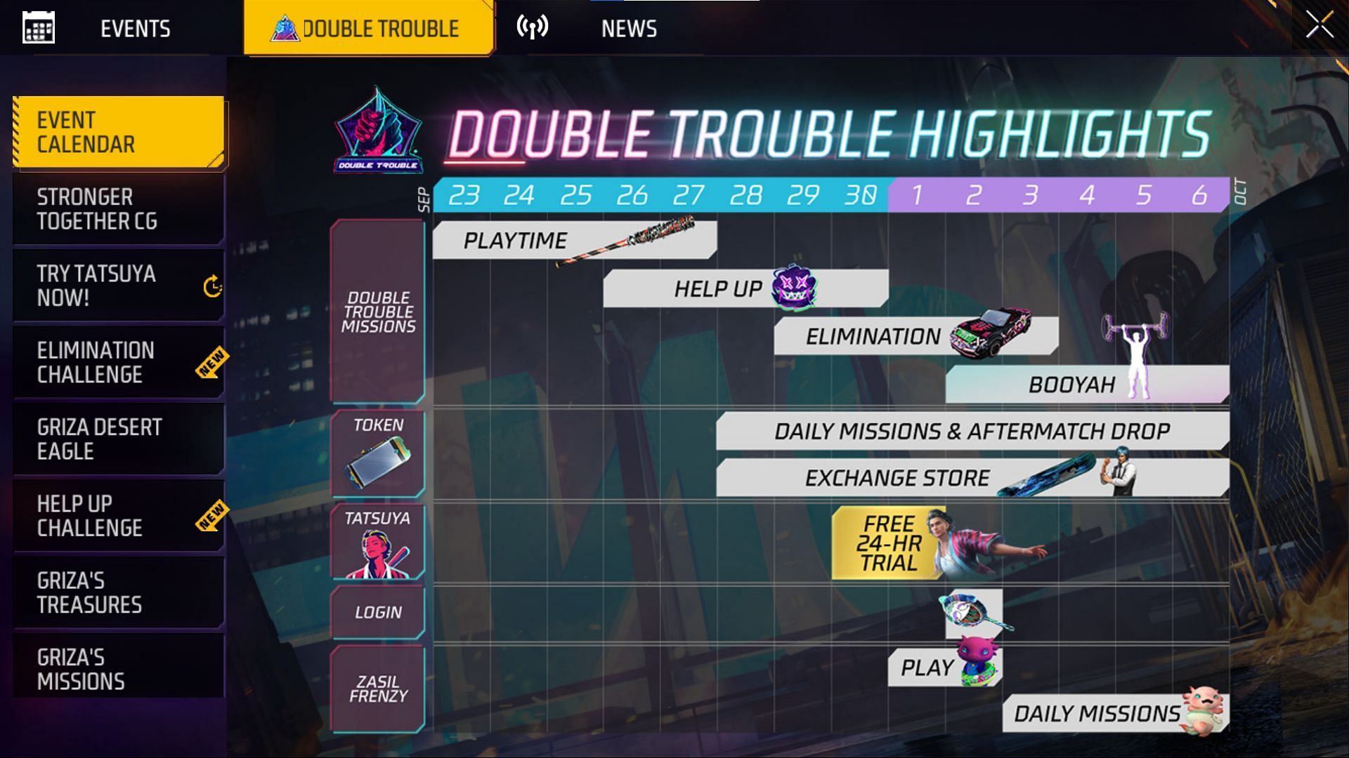 The Elimination Challenge is part of the Double Trouble Missions, where Free Fire MAX players have to take down a specified number of opponents between the dates of September 29, 2022 and October 3, 2022. The event's three rewards, along with their corresponding set of missions, are as follows:
