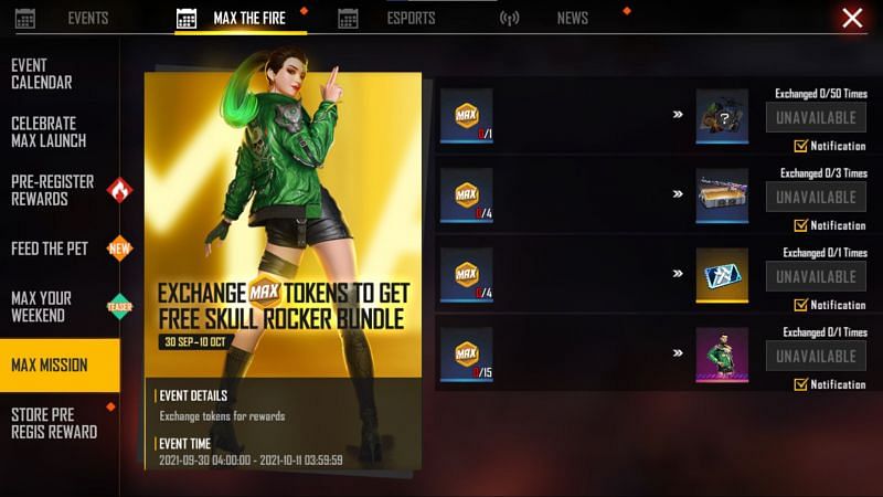 Max Mission is an ongoing event that offers players the Skull Rocker Bundle and a few other rewards. They would have to collect a specific number of MAX tokens in-game and exchange them for the items. The tokens can be attained by completing specific daily missions.