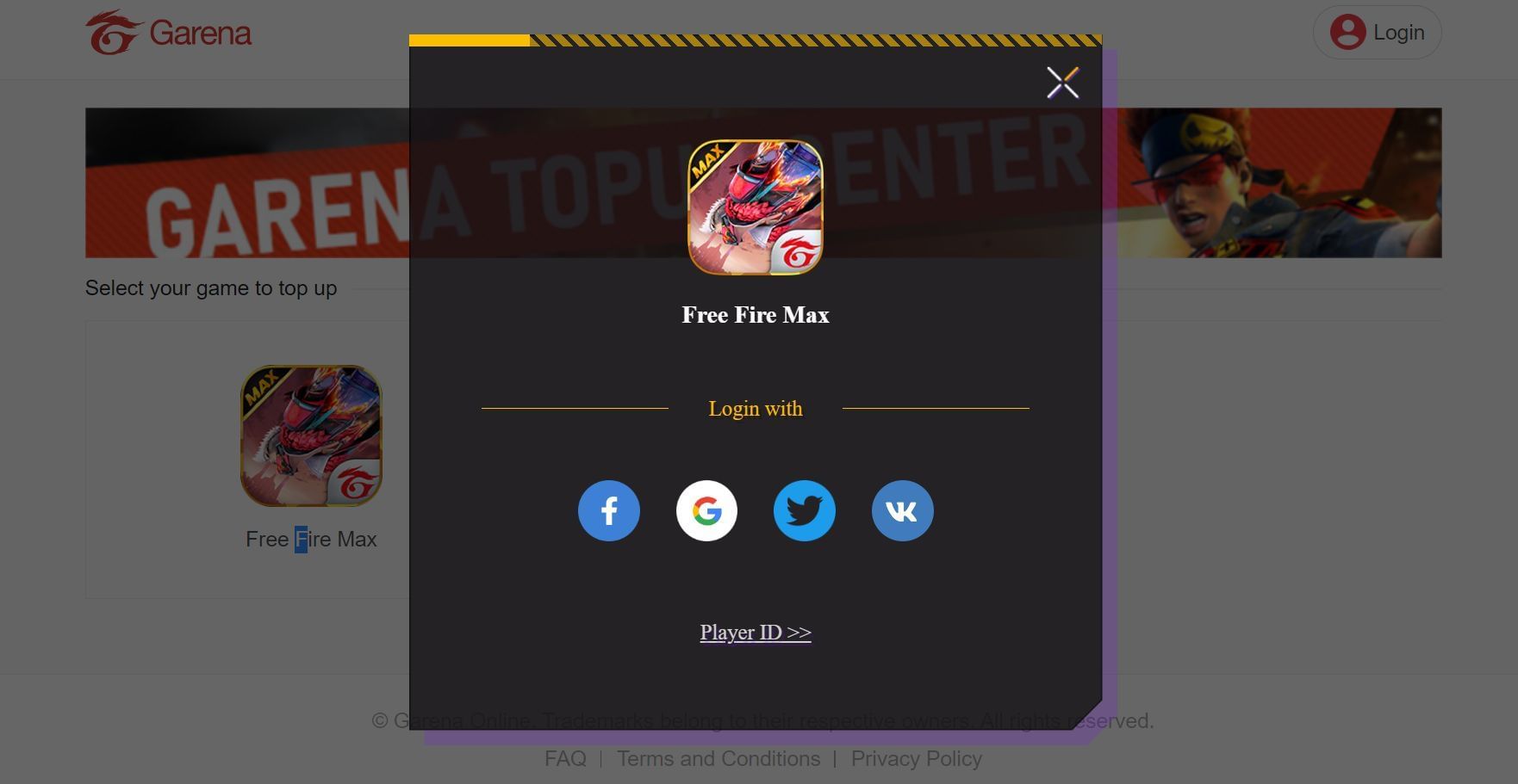 Step 2: You can select the ‘Free Fire MAX’ option and sign in using one of the four platforms: Facebook, Google, Twitter, and VK. Alternatively, you can also enter your in-game Player ID to sign in.