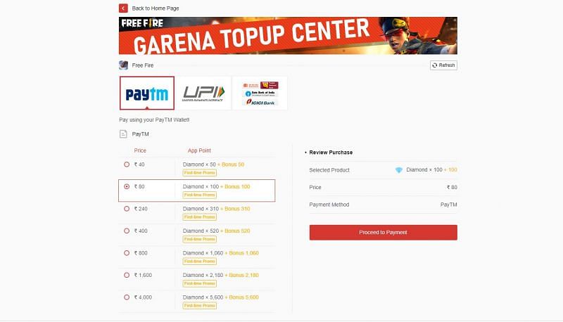 Step 3: Many top-up options and payment methods will appear on the screen. Players should select the desired top-up amount from the list and make the payment through one of the available options: PayTM, Netbanking, UPI.