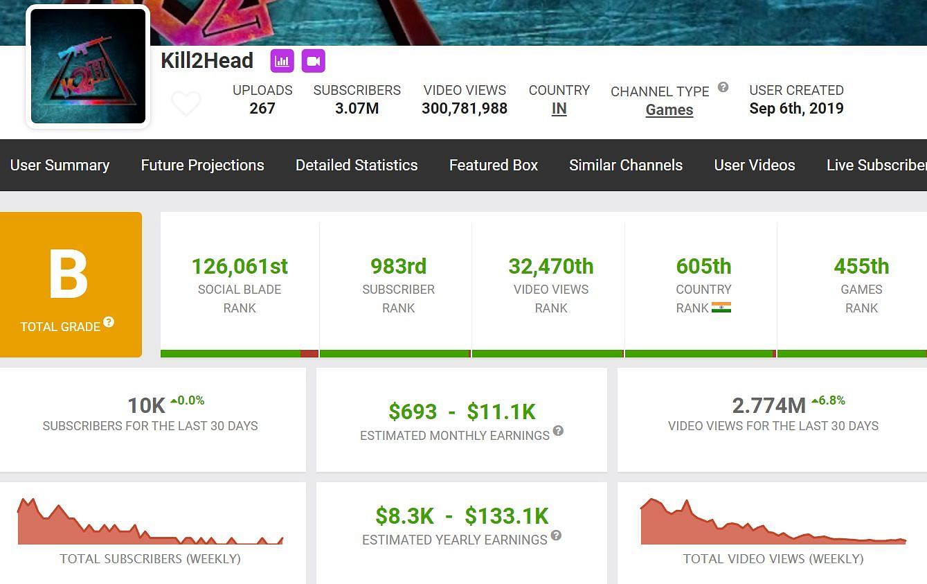 Kill2Head’s monthly YouTube earnings are between $693 and $11.1K. On the other hand, the projected yearly income of the content creator ranges from $8.3K to $133.1K. (Source: Social Blade)