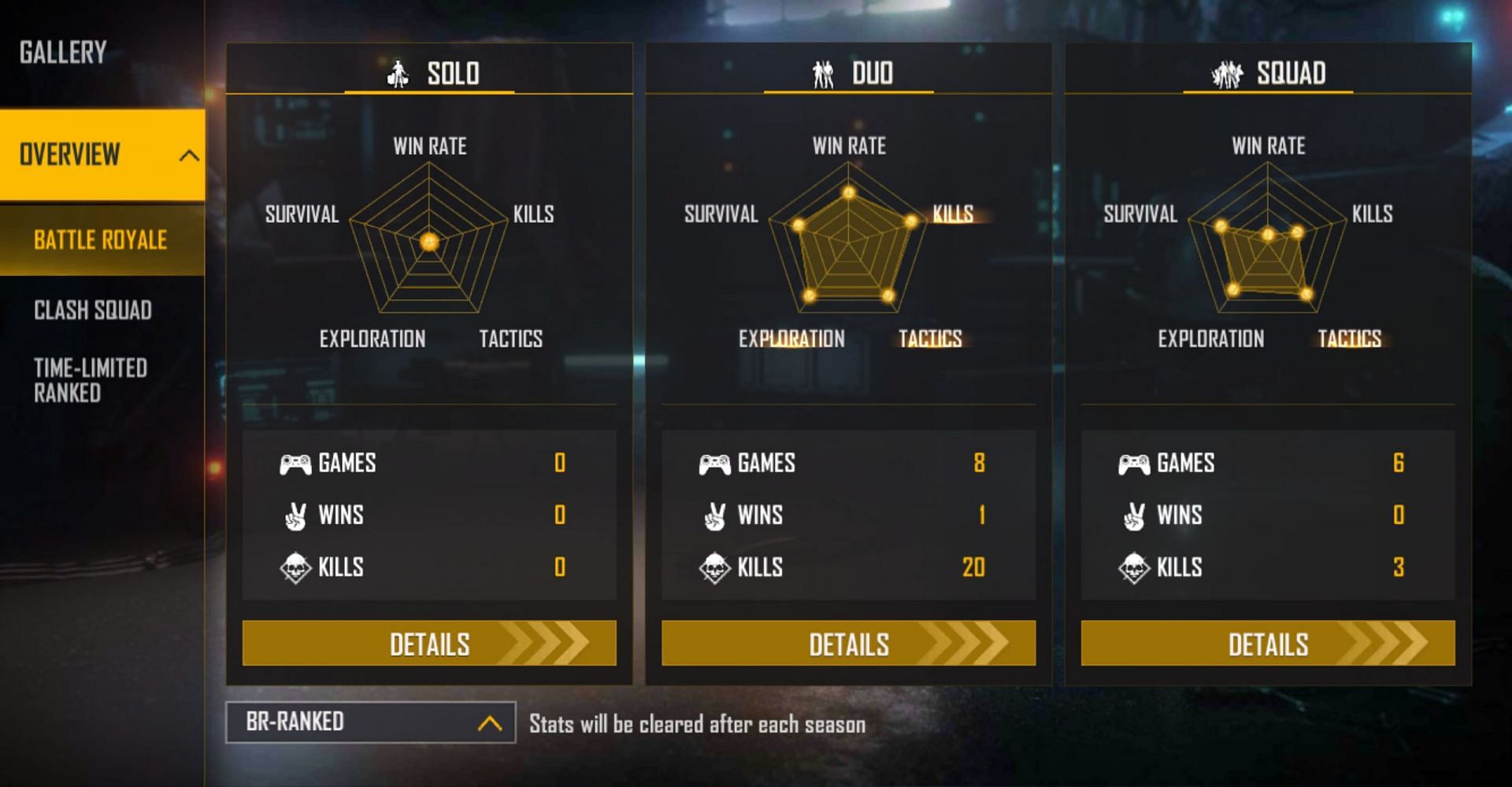 Apart from this, the content creator has participated in eight duo games and has a single victory, possessing a win percentage of 12.50%. He has notched up 20 kills for a K/D ratio of 2.86.