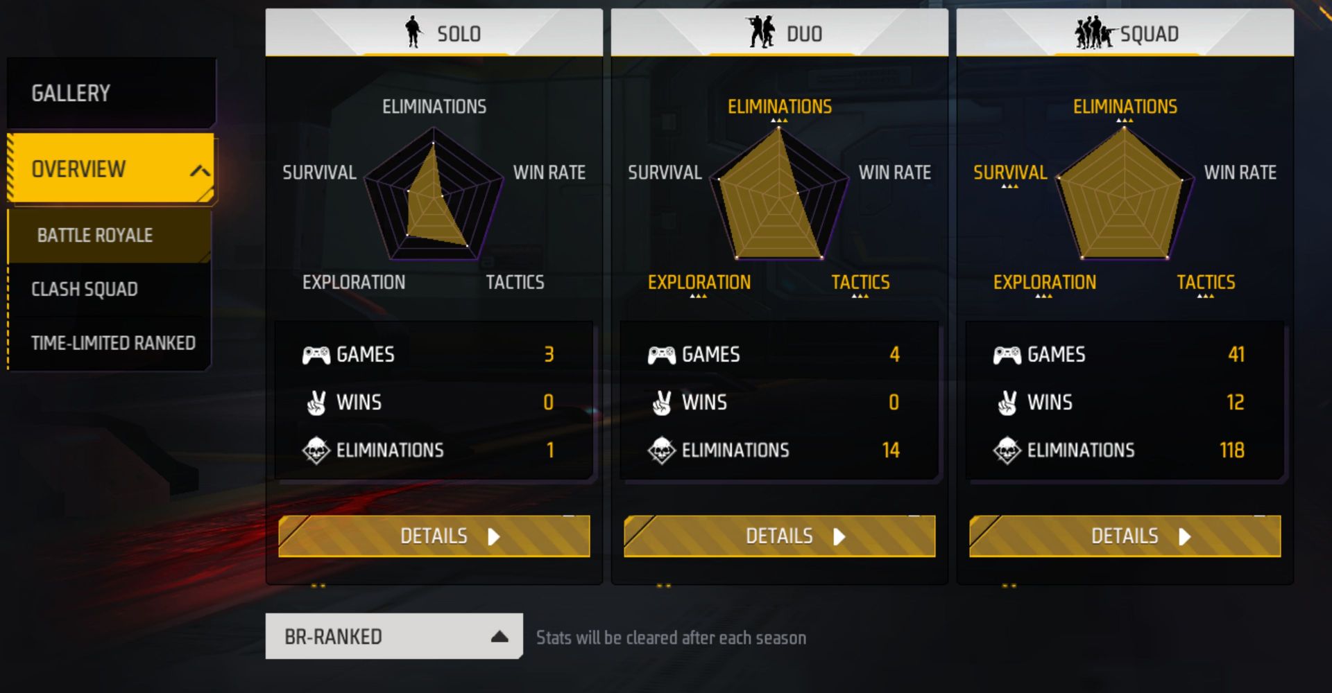 In duo mode, he has appeared in 259 games and has 28 Booyahs, converting to a win percentage of 10.81%. There are 532 kills to his name for a K/D ratio of 2.30.