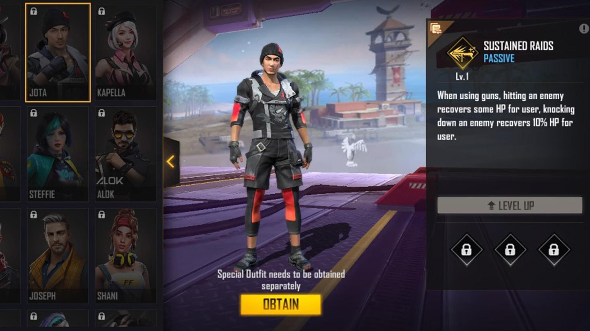 Jota's passive ability in Free Fire MAX grants a little HP recovery if they land shots on an enemy, and recovers 10% HP if an enemy is knocked down. This can be a lifesaver while fighting within the zone.