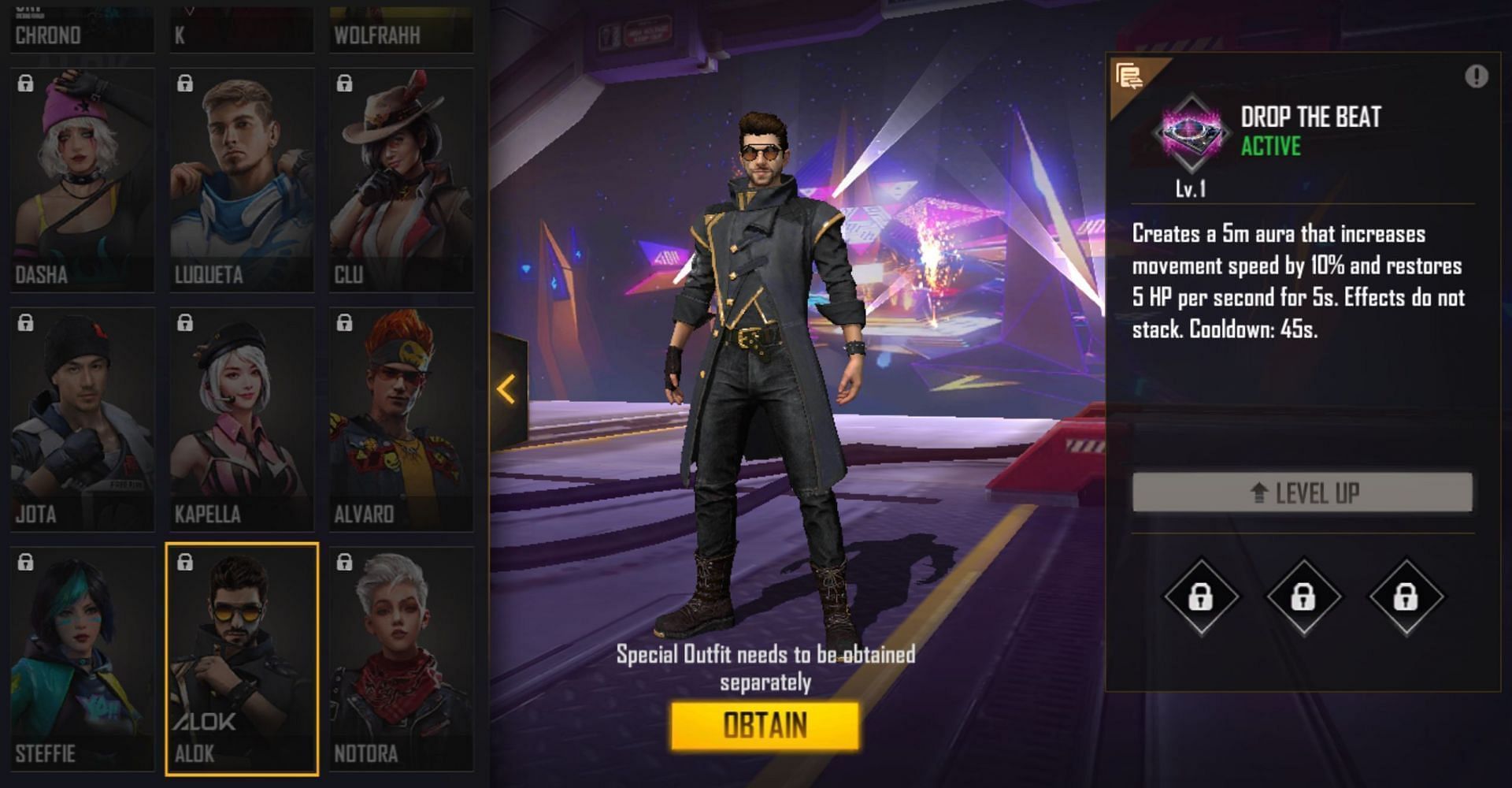 With a cooldown time of 45 seconds, Alok's ability creates a 5-meter aura that increases movement speed by 10% and restores HP at a rate of 5 HP/s for 5 seconds. Players must note that similar effects are not stacked.