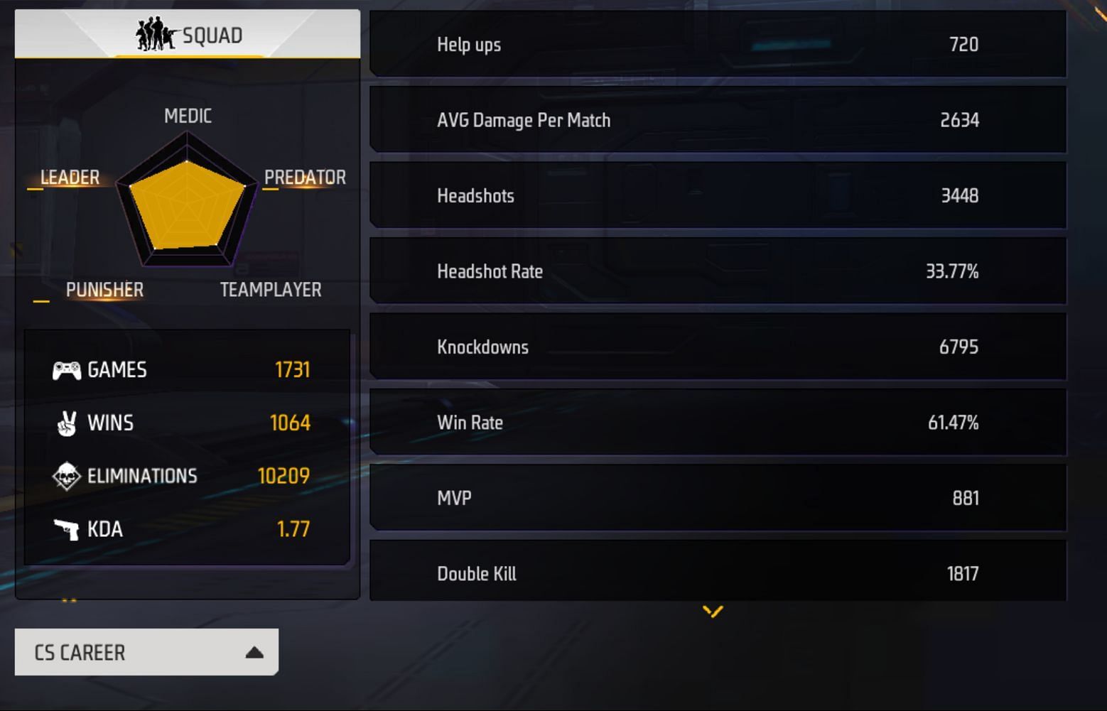 The YouTuber has participated in 1731 Clash Squad matches and outperformed his opposition in 1064 games, which comes down to a win rate of 61.47%. He has also acquired 10209 frags and 3448 headshots, translating to a KDA of 1.77 and a headshot percentage of 33.77%.
