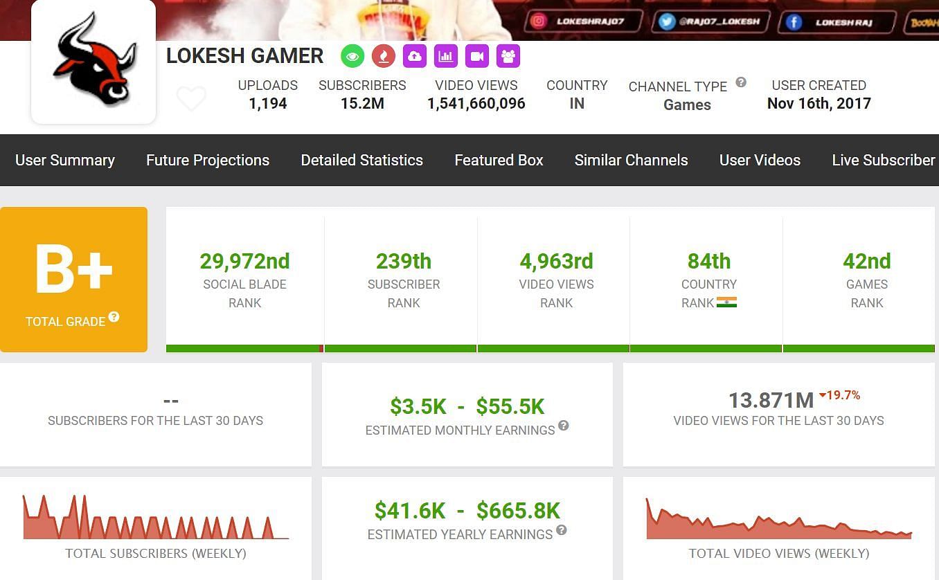 Social Blade reports that Lokesh Gamer’s monthly income lies between $3.5K and $55.5K. At the same time, his revenue for the entire year is approximately between $41.6K and $665.8K.