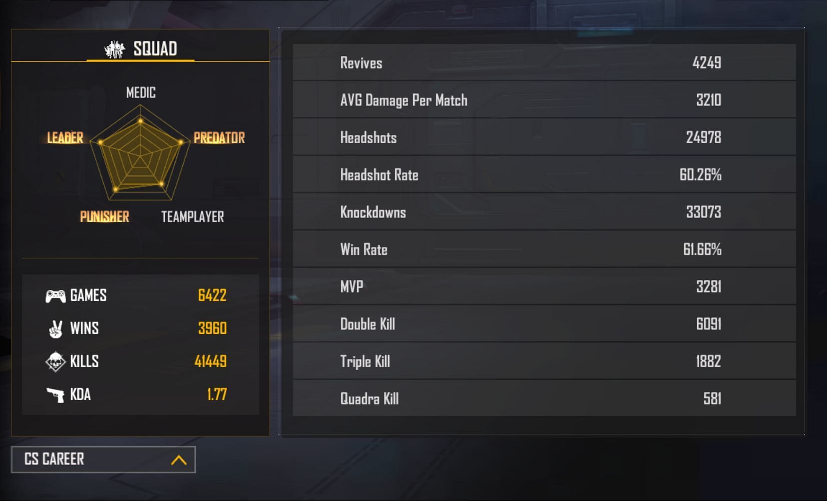 The player has completed 6422 squad games and tallied 3960 wins, attributing to a win rate of 61.66%. He has accrued 41449 kills in the mode, upholding a KDA of 1.77 as the average damage per match stands at 3210.