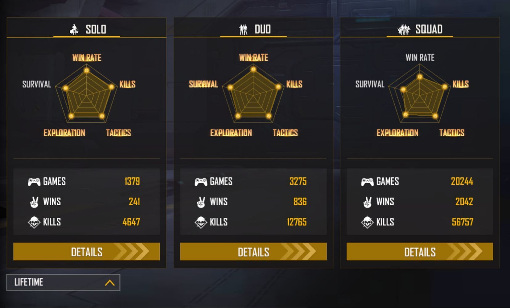 The streamer has recorded 20244 squad appearances to secure 2042 Booyahs, accounting for a win ratio of 10.08%. He has taken out 56757 opponents while maintaining a kill-to-death ratio of 3.12.