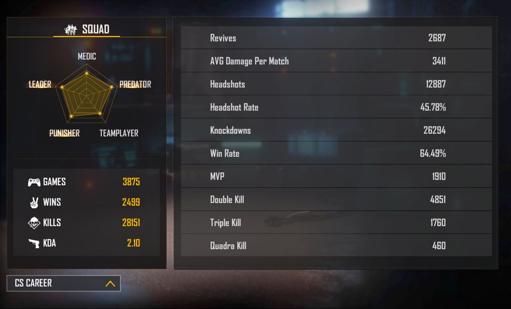 Mr Ali has participated in 3875 Clash Squad matches in Free Fire and has won 2499 of these encounters for a win rate of 64.49%. He also holds a KDA of 2.10 and average damage per match of 3411. He has secured a total of 28151 kills.