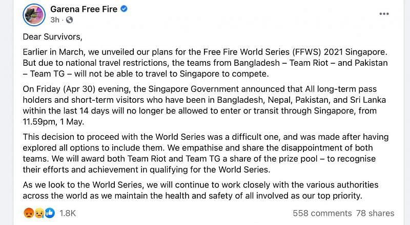 In the latest development, Garena has notified interested parties that due to new travel restrictions, teams from Bangladesh and Pakistan won't be able to travel to Singapore to compete in the FWS 2021.