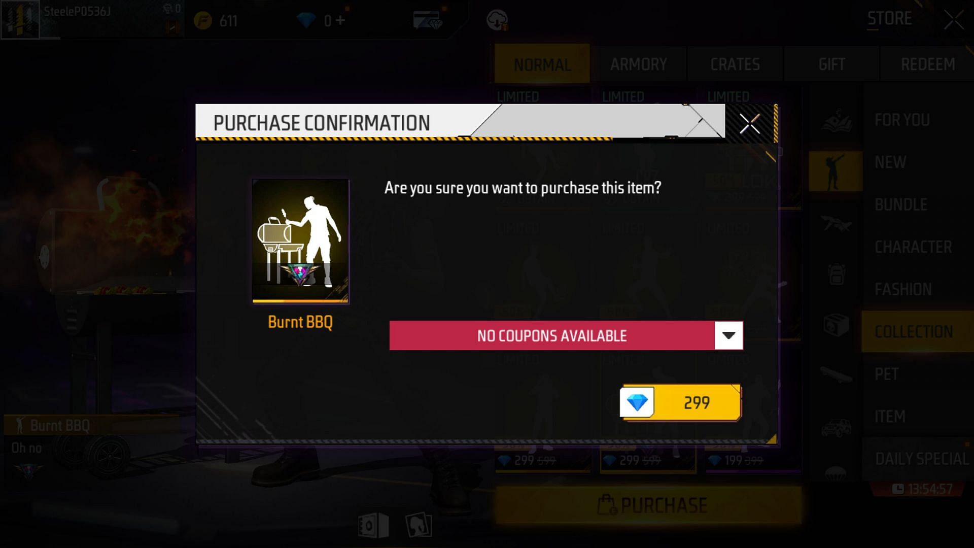 A purchase confirmation dialog box will be displayed on the screen. After approving the purchase, diamonds will be deducted from the account, and emotes can be equipped through the vault section.