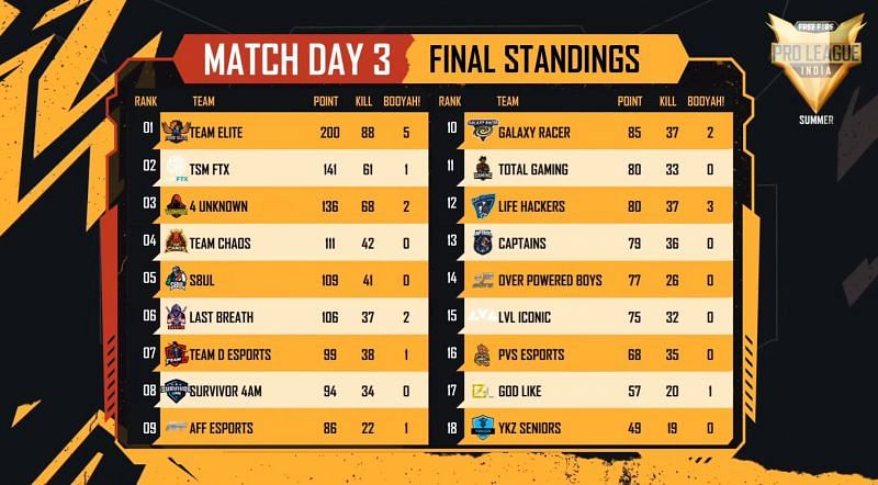 In the overall points table, Team Elite dislodged 4 Unknown from pole position with 88 kills and 200 points while TSM FTX bagged second place with 61 kills and 141 points.