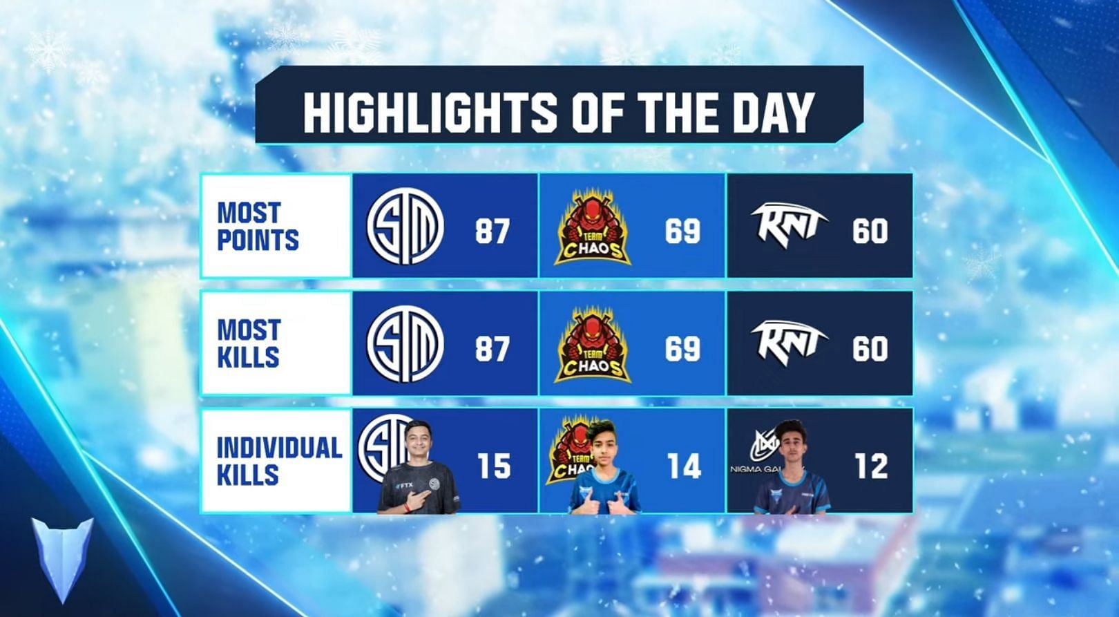 TSM accumulated a whopping 86 points, which took them to first place with a cumulative total of 154. Chemin Esports didn't play today but slipped to second place with 148 points. Revenant Esports didn't win any matches today but they managed to grab third place, while Total Gaming had an average day as they managed to grab eighth place.