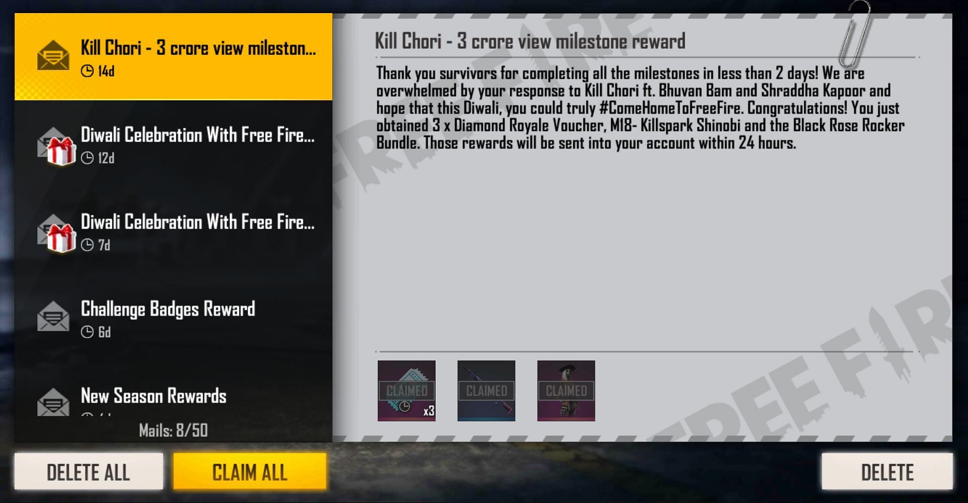 Garena also released a new redeem code to mark the milestones for the latest Free Fire Diwali Music video – Kill Chori, featuring Shraddha Kapoor and Bhuvan Bam. Although the developers released the code about a week back, it still works and offers a permanent bundle and skin reward.