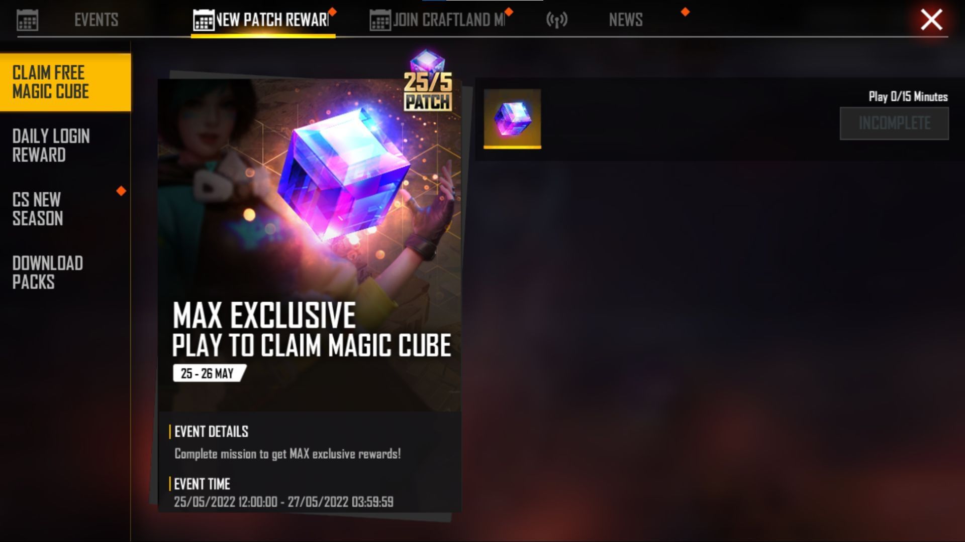 Step 2: Head over to the 'New Patch Rewards' and select the 'Claim Free Magic Cube' event.