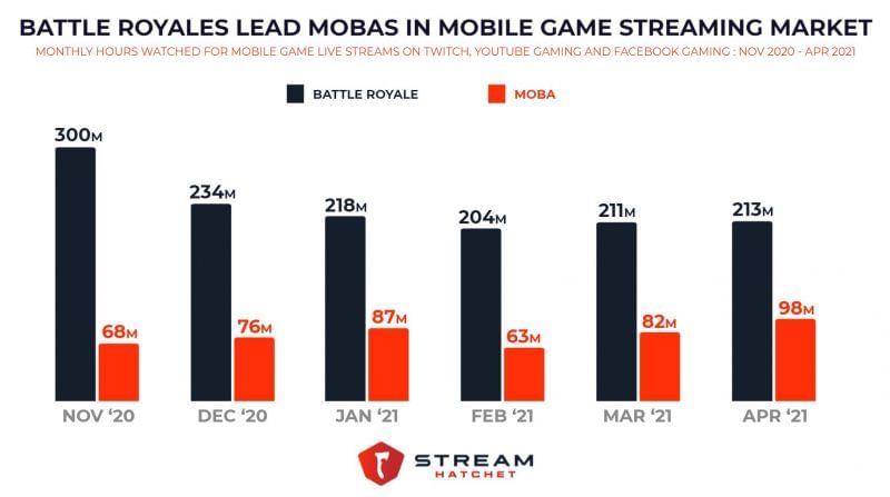 Battle royale games like PUBG Mobile and Free Fire generated an average of 151 million more monthly hours watched than mobile MOBA games. While battle royales are considerably more popular in the mobile gaming ecosystem, watch time from November to April has decreased by 29%.