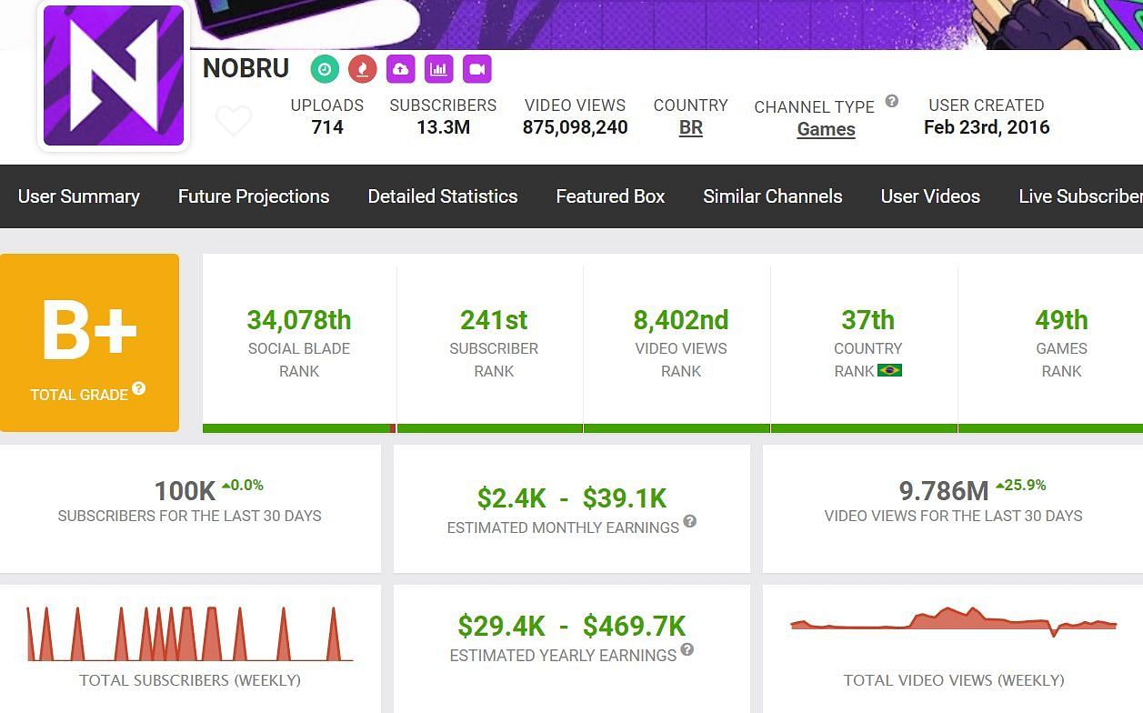 According to Social Blade, Nobru's monthly income through his channel is between $2.4K and $39.1K.