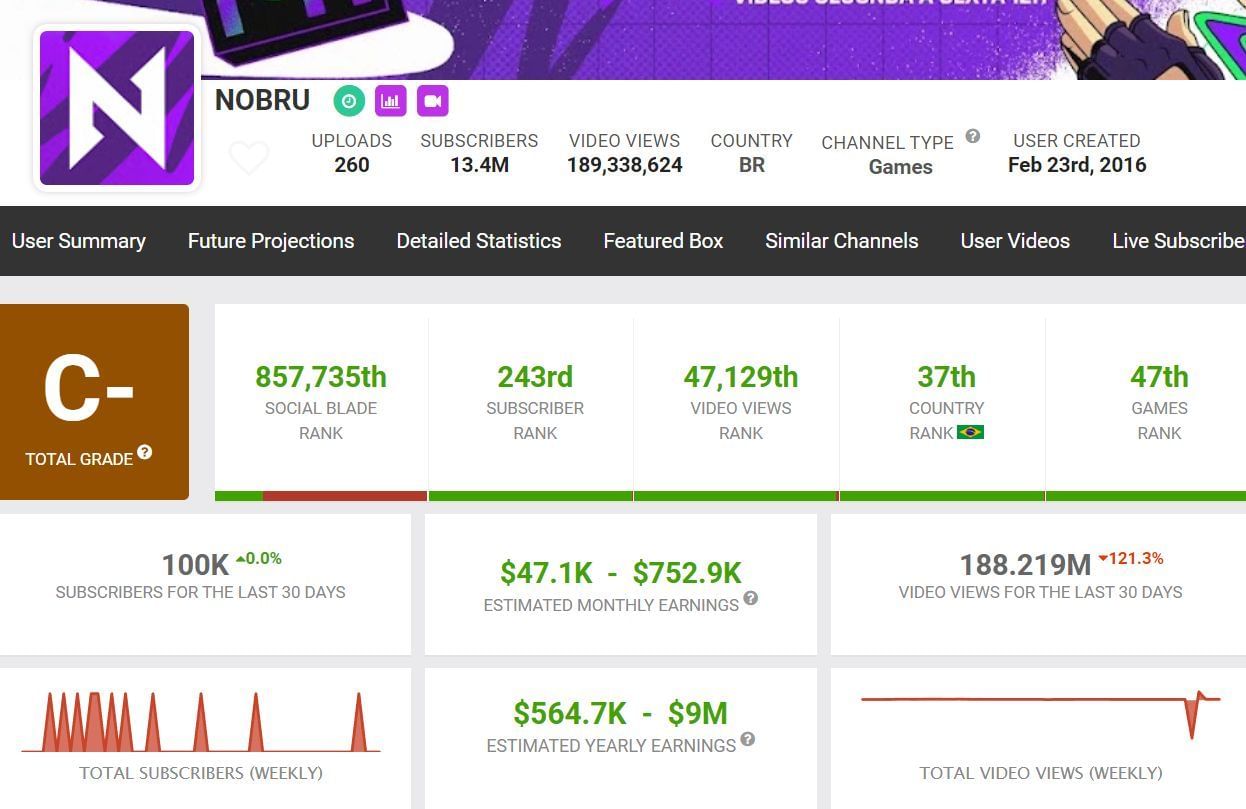 Nobru’s monthly income from his channel lies between $47.1K and $752.9K. His yearly earnings lie between $564.7K and $9 million (Source: Social Blade)