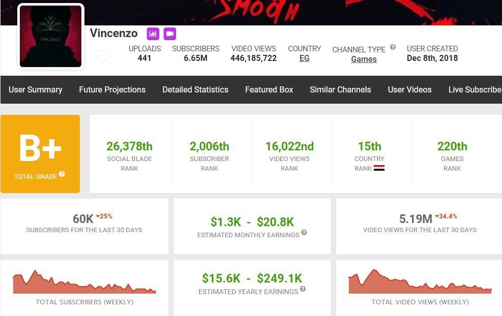 As per Social Blade, OP Vincenzo's monthly and yearly earnings from this channel lie in the range of $1.3K - $20.8K and $15.6K - $249.1K.