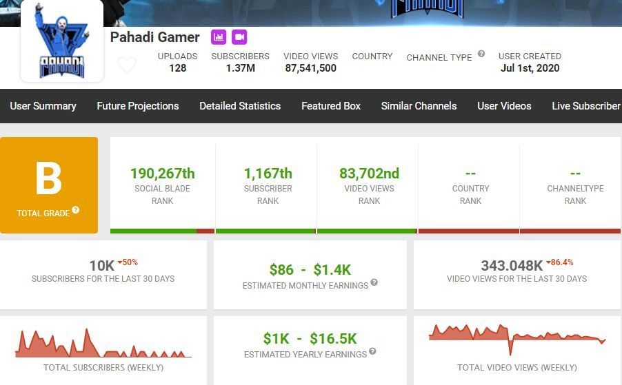Lokesh’s earnings from the Pahadi Gamer YouTube channel are estimated to be between $86 and $1.4K. Social Blade also approximates his yearly income to be around $1K to $16.5K.