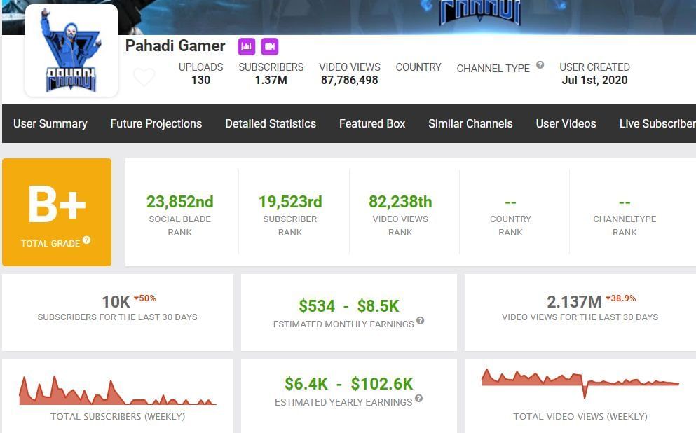Pahadi Gamer is well renowned for his fantastic and jaw-dropping gameplay videos, which he regularly uploads to his YouTube channel. He has grown immensely over a relatively small period of time, and within the last 30 days, he has gained 10 thousand subscribers and 2.137 million views.
