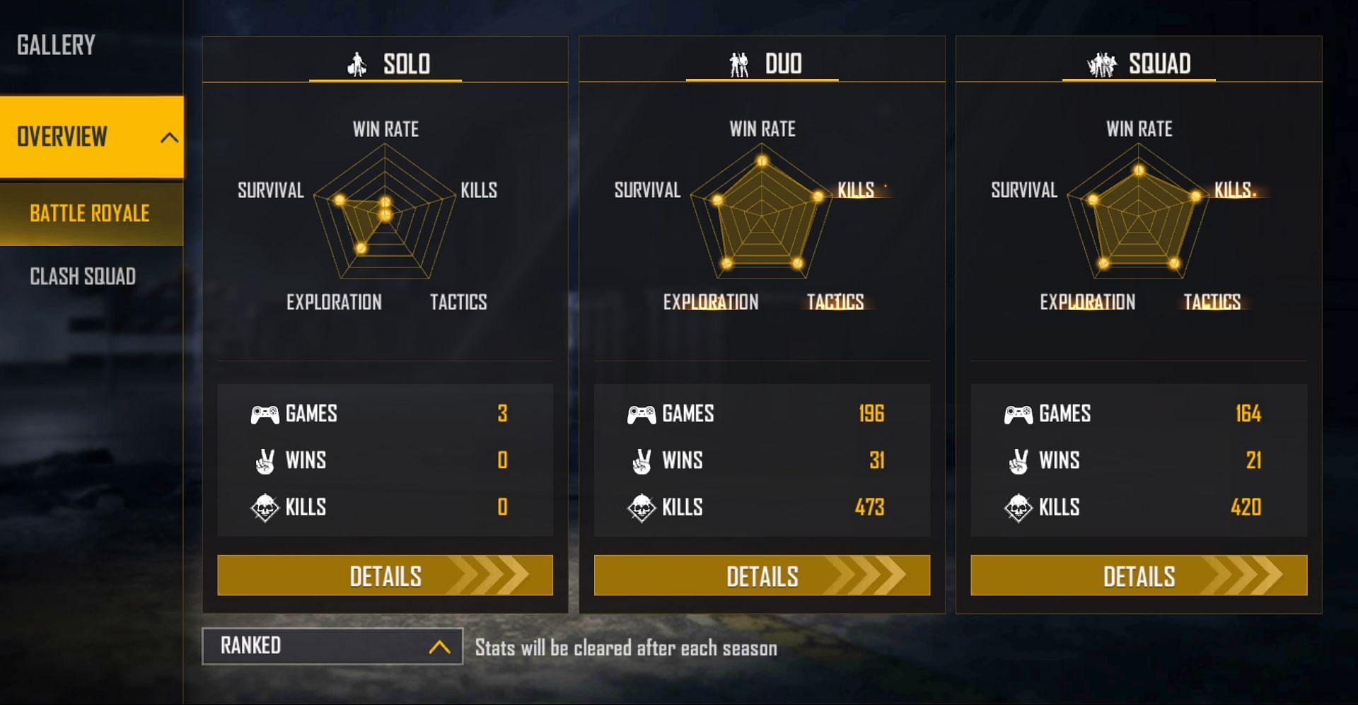 He has 31 booyahs in 196 duo encounters, maintaining a 15.81% win percentage. The content creator has registered 473 kills, ensuring him a K/D ratio of 2.87.