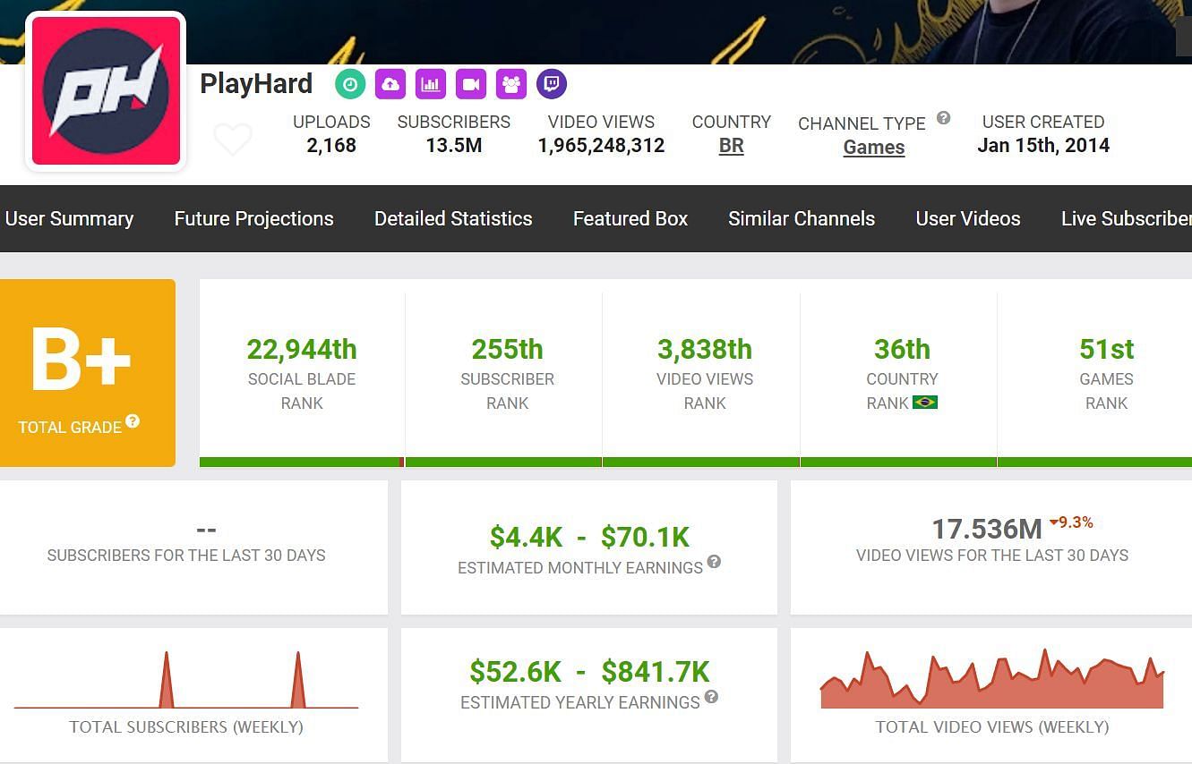 According to Social Blade, PlayHard’s monthly YouTube earnings lie between $4.4K - $70.1K. On the other hand, the projected yearly income from the channel ranges from $52.6K to $841.7K.