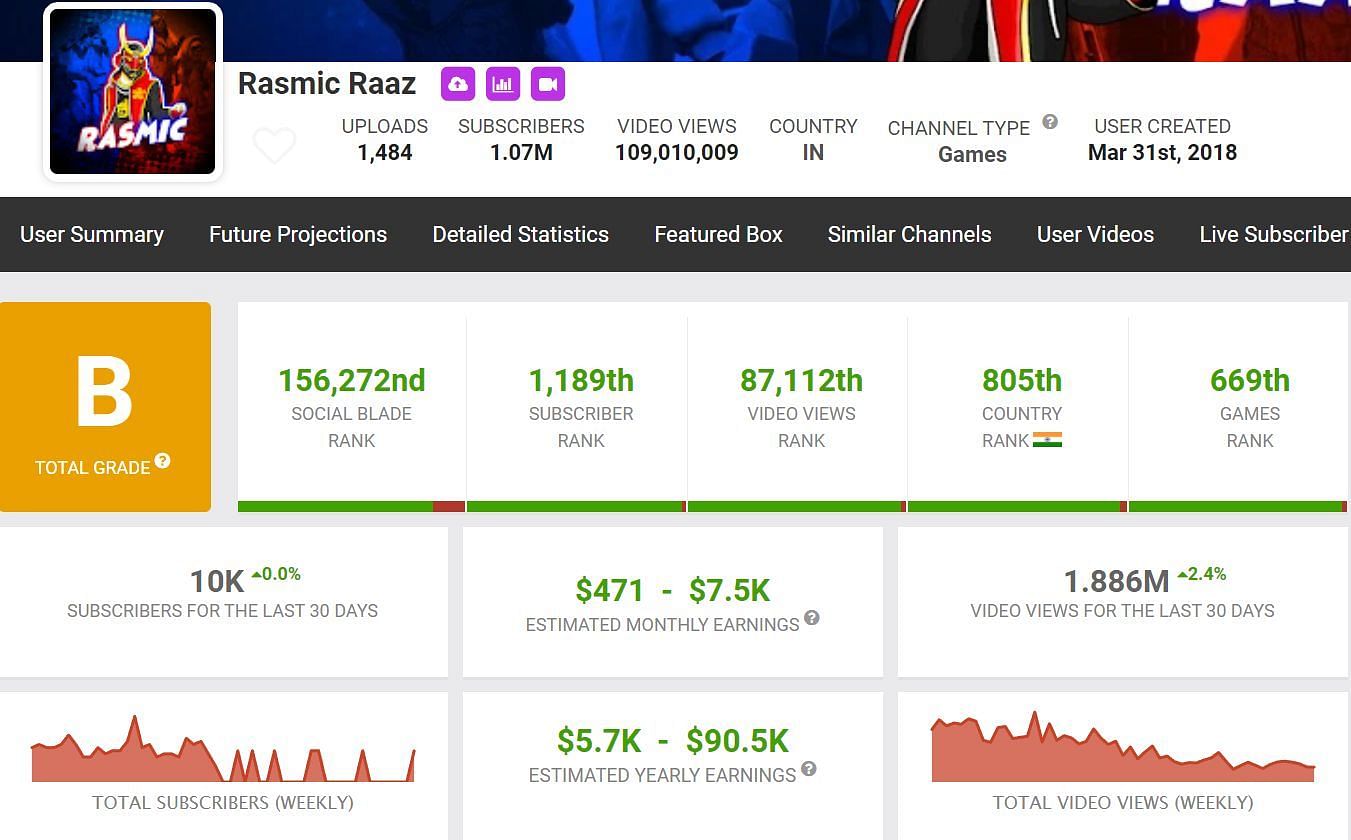 Social Blade estimates Rasmiranjan's monthly earnings from the Rasmic Raaz YouTube channel to be between $471 and $7.5K. The figures for the entire year are estimated at around $5.7K and $90.5K.