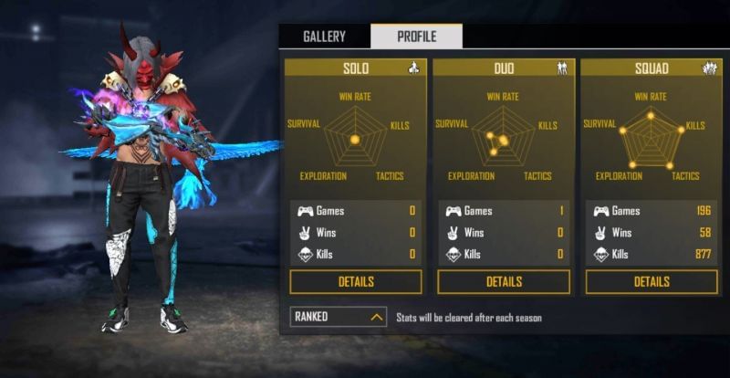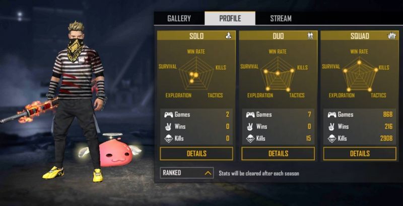 The popular content creator has also played 859 solo matches and has 127 Booyahs, having a win percentage of 14.78%. He has killed 1887 opponents in the mode for a K/D ratio of 2.58.