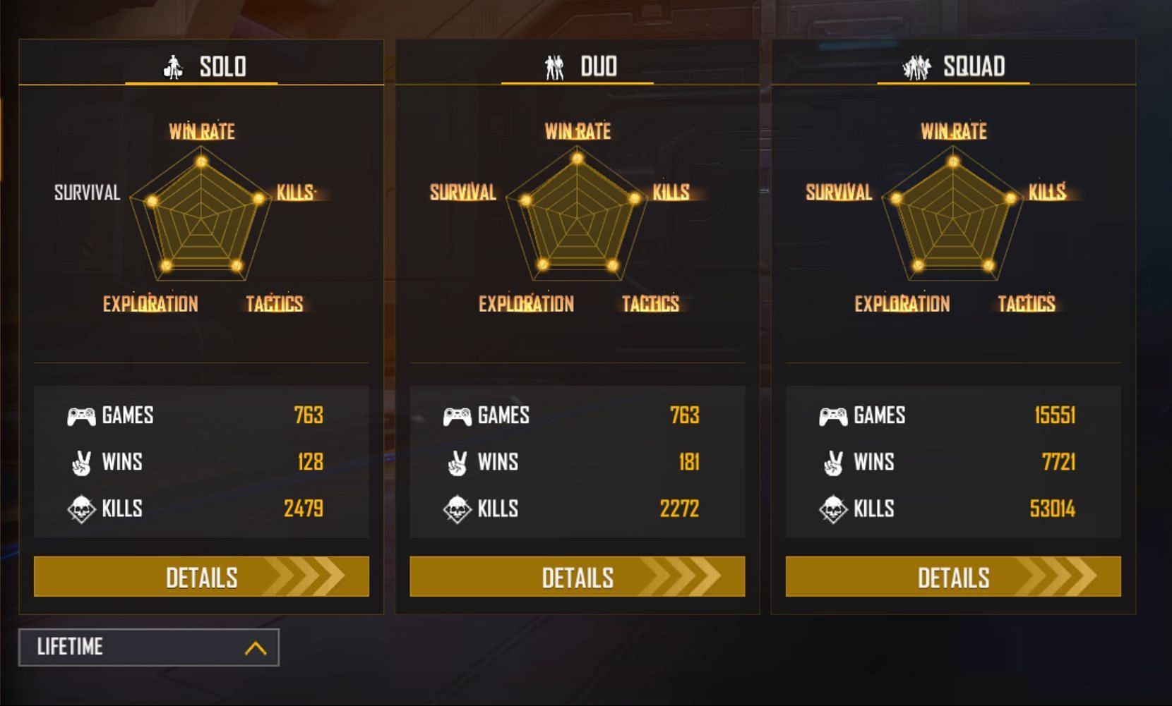 The player has 763 solo matches to his profile and has earned first place on 128 occasions, ensuring a win rate of 16.77%. With 2479 eliminations and 754 headshots, he has maintained a K/D ratio of 3.90 and a headshot rate of 30.42%.