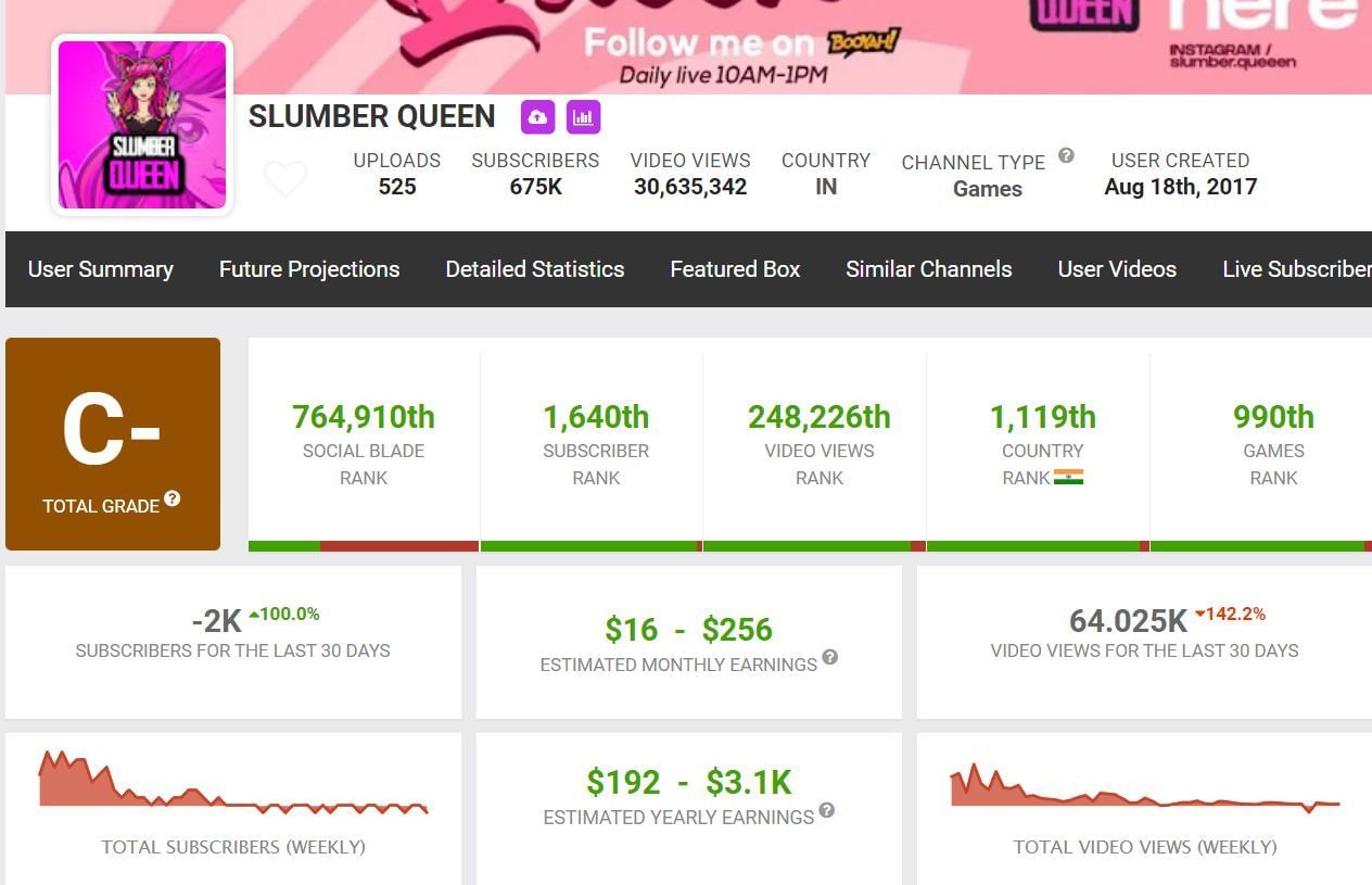 According to the official Social Blade website, Slumber Queen’s monthly income via her channel lies between $16 and $256. The content creator’s yearly earnings range from $192 to $3.1K.