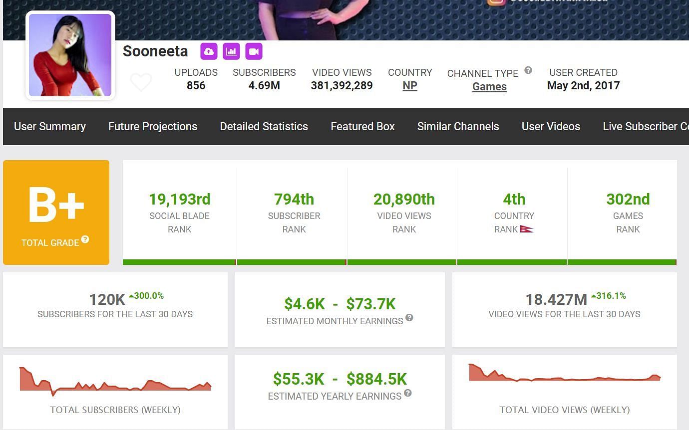 Sooneeta’s monthly income lies in the range of $4.6K and $73.7K. (Source: Social Blade).