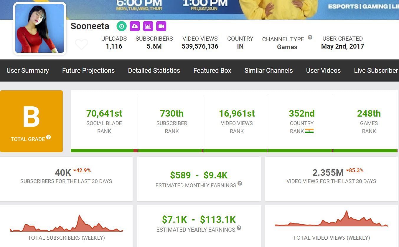 As per Social Blade, Sooneeta makes approximately between $589 and $9.4K per month through the Sooneeta YouTube channel. The earnings for the entire year at the given viewership level are projected to be between $7.1K and $113.1K.