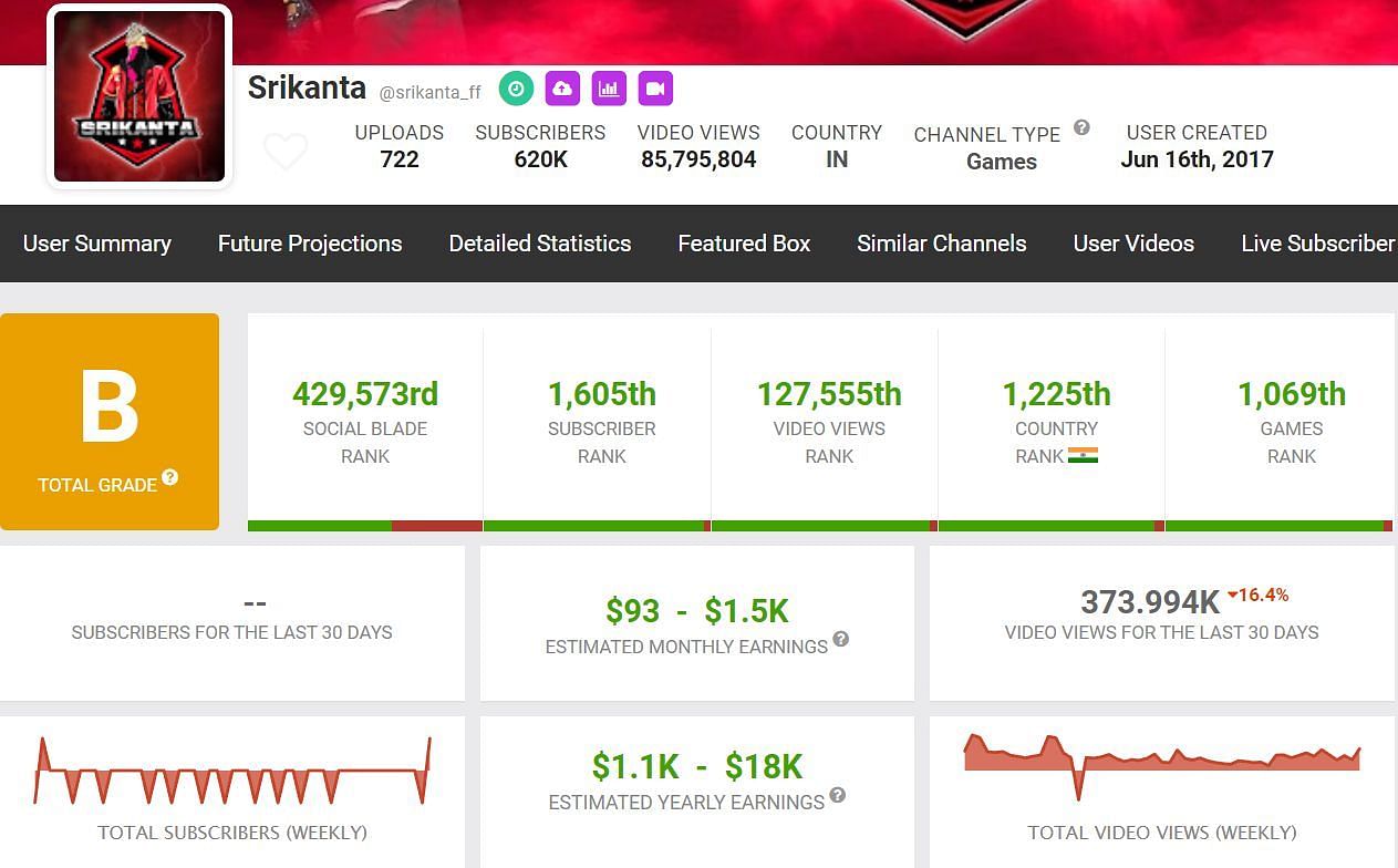 Per the Social Blade estimates, Srikanta's channel makes between $93 and $1.5K monthly. When extended to the entire year, the forecast will likely range from $1.1K to $18K.