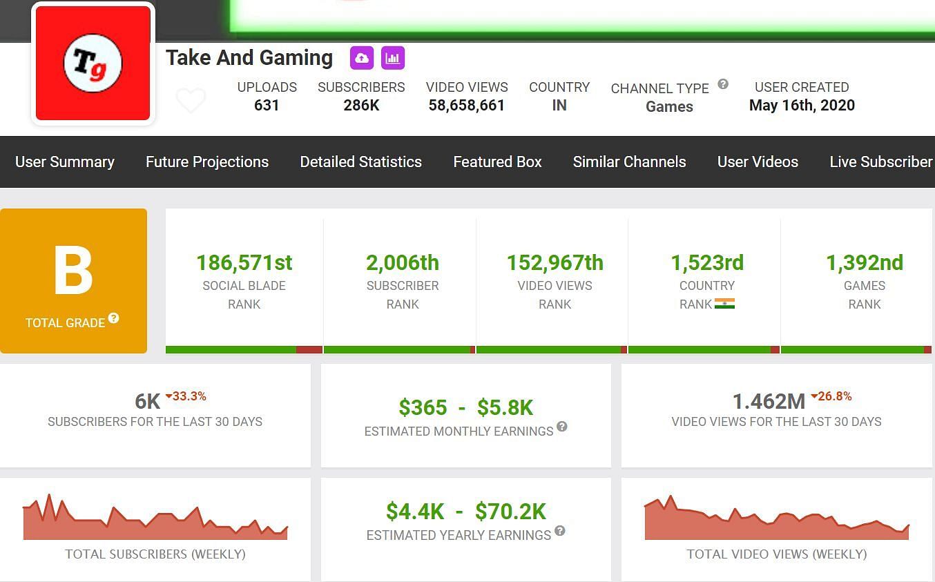 Manoj Gupta is estimated to earn within the range of $365 and $5.8K every month through the Take and Gaming channel. Social Blade further estimates his income for the entire year to be between $4.4K and $70.2K.