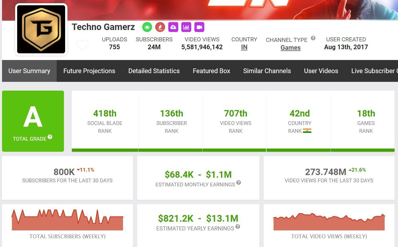 On the Social Blade website, Techno Gamerz’s monthly earnings through his channel lie between $68.4K and $1.1 million. In contrast, the yearly earnings are stated in the range of $821.2K and $13.1 million.