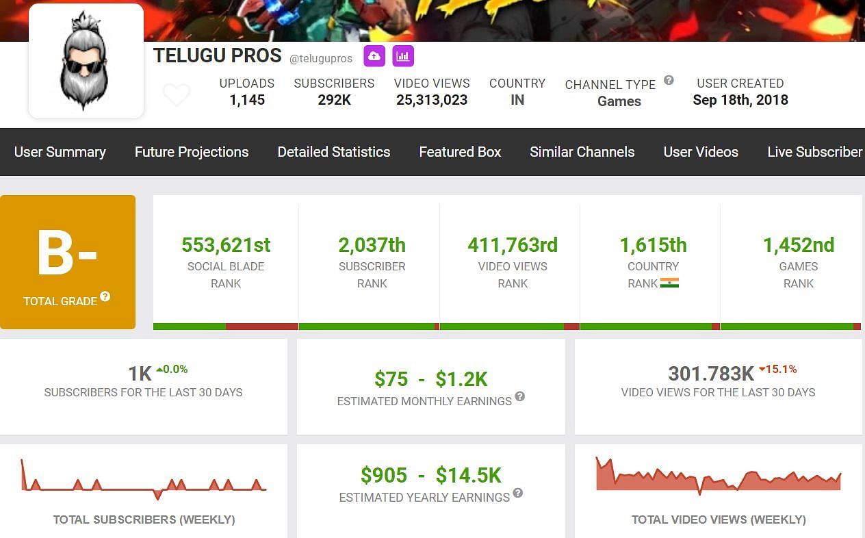 Social Blade estimates the revenue from Telugu Pros channel to range between $75 and $1.2K. Similarly, the earnings for the entire year are projected to be in the range of $905 to $14.5K.