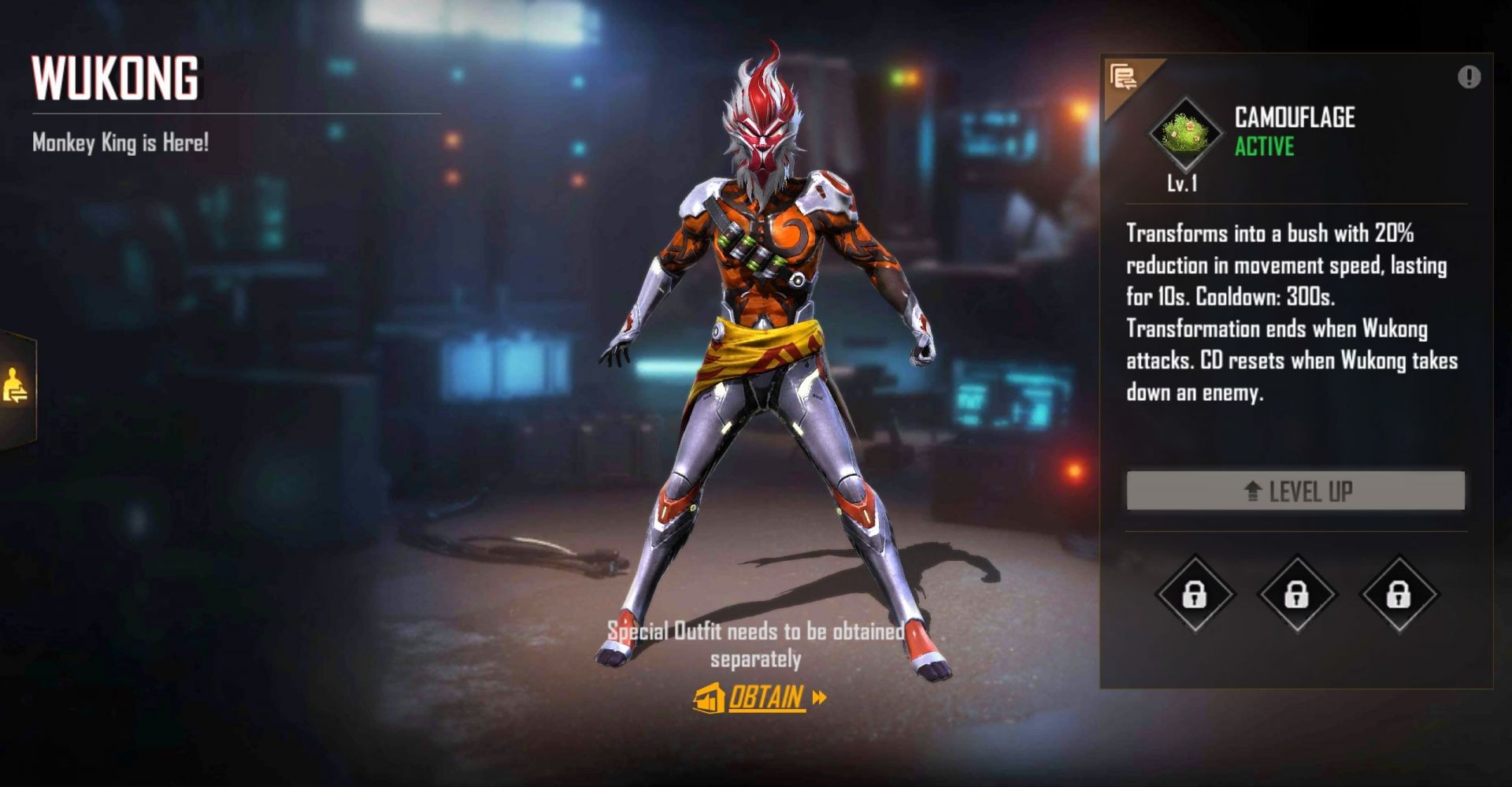 Wukong’s ability will convert users into a bush while having a 20% reduction in their movement speed. This transformation will last 10 seconds, and it will automatically end when they attack a foe.