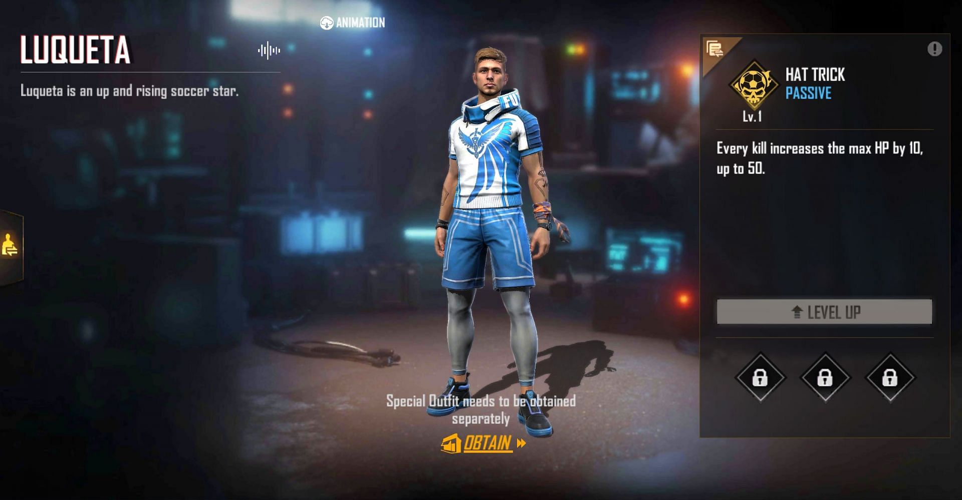 When Luqueta is equipped in Free Fire, the maximum HP increases by 10 points, up to 50 points after every kill.