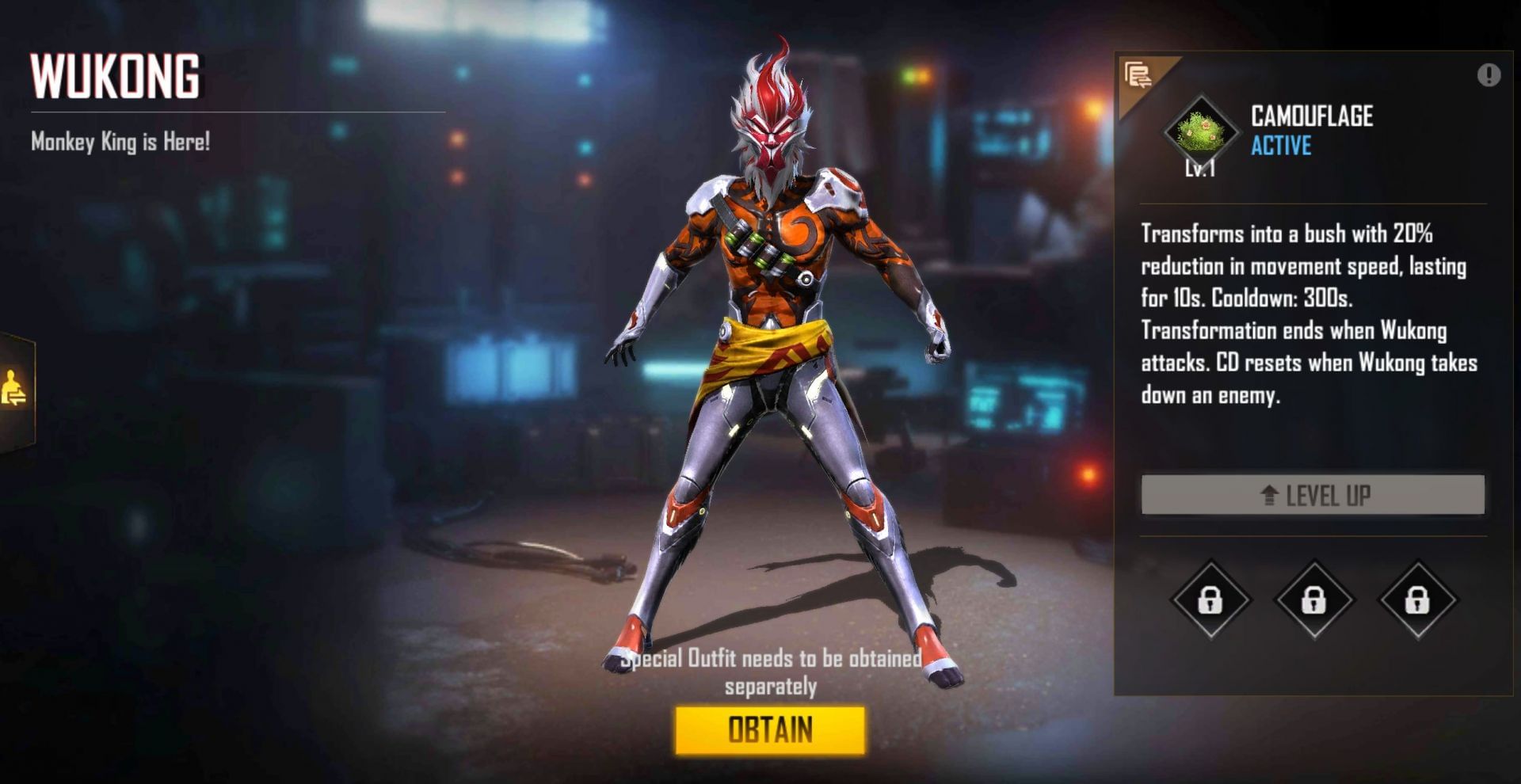 Wukong can help users transform into a bush with 20% reduced movement speed. This transformation lasts only for 10 seconds and comes with a massive cooldown of 300 seconds. However, this cooldown resets whenever users take down an opponent.