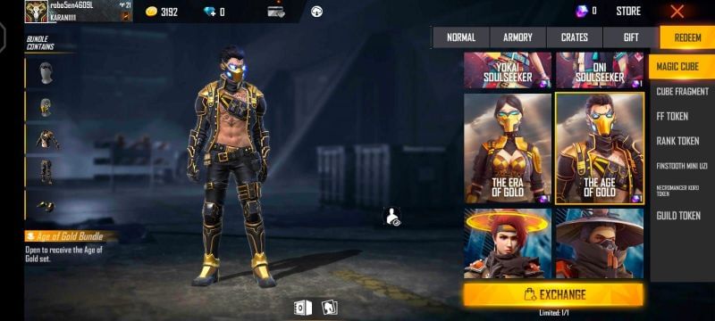 The Age of Gold Bundle, which was recently available as a redeemable reward with a temporary validity of seven days, is an old Free Fire Bundle. It was first introduced in July 2020 through Diamond Royale and a similar female bundle, The Era of Gold.