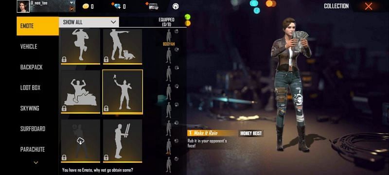 Make it Rain is a result of the collaboration between the hit series Money Heist and Free Fire. The duo introduced interesting items like the Money Heist-inspired gloo wall skin, outfits, and other emotes like I'm Rich and Power of Money.