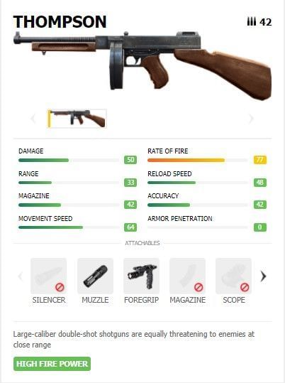 The Thomson is a weapon available for players who like to have control over their spray. This weapon is stable, offers 50 damage, and has a high fire rate of 77. Moreover, the reload speed is significantly less, so users can get those crucial shots in before enemies reload their guns. In terms of attachables, gamers can use a muzzle and foregrip with this weapon.