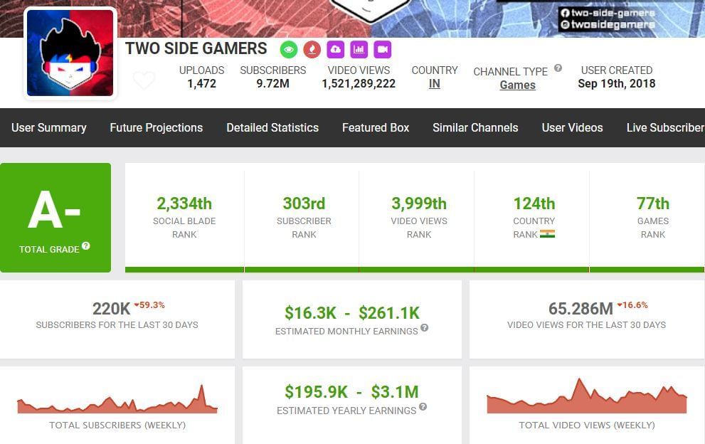 The monthly and yearly earnings from the TWO SIDE GAMERS channel are between $16.3K to $261.1K and $195.9K to $3.1 million, respectively.